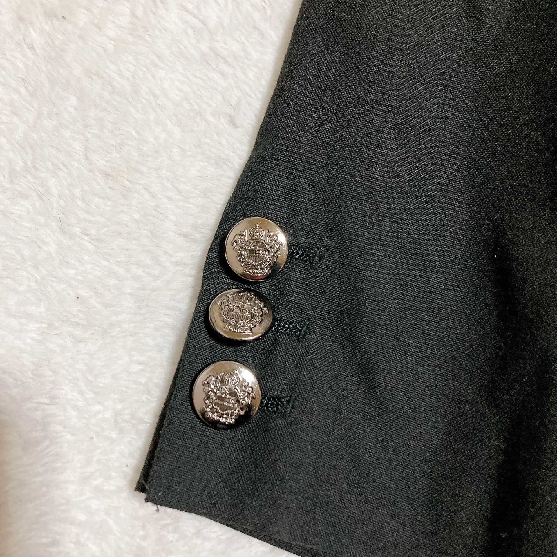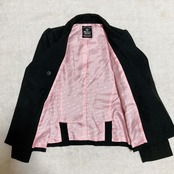 ブラックの生地にシルバーのボタンが映えるシックなデザインですが、裏地は鮮やかなピンクのハート総柄になっており、脱いだ時もとっても可愛いです。